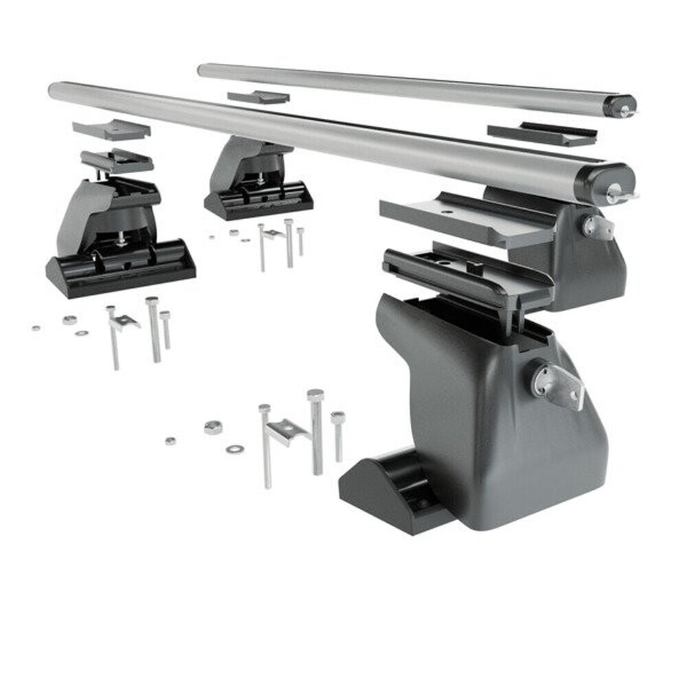 В комплект входит две поперечины и четыре опоры, для установки на автомобили без рейлингов и штатных монтажных мест. Металлические скобы, в основании опор, маркируются под каждую группу автомобилей D1-D7 имеют разную длину и изгиб, для лучшей совместимости и позволяют закрепить их за дверной проем. Резиновые прокладки закрепленные на скобах не дадут оставить царапины при эксплуатации багажника.Собранная конструкция крепко держится и позволяет перевозить грузы весом не больше 75 кг.