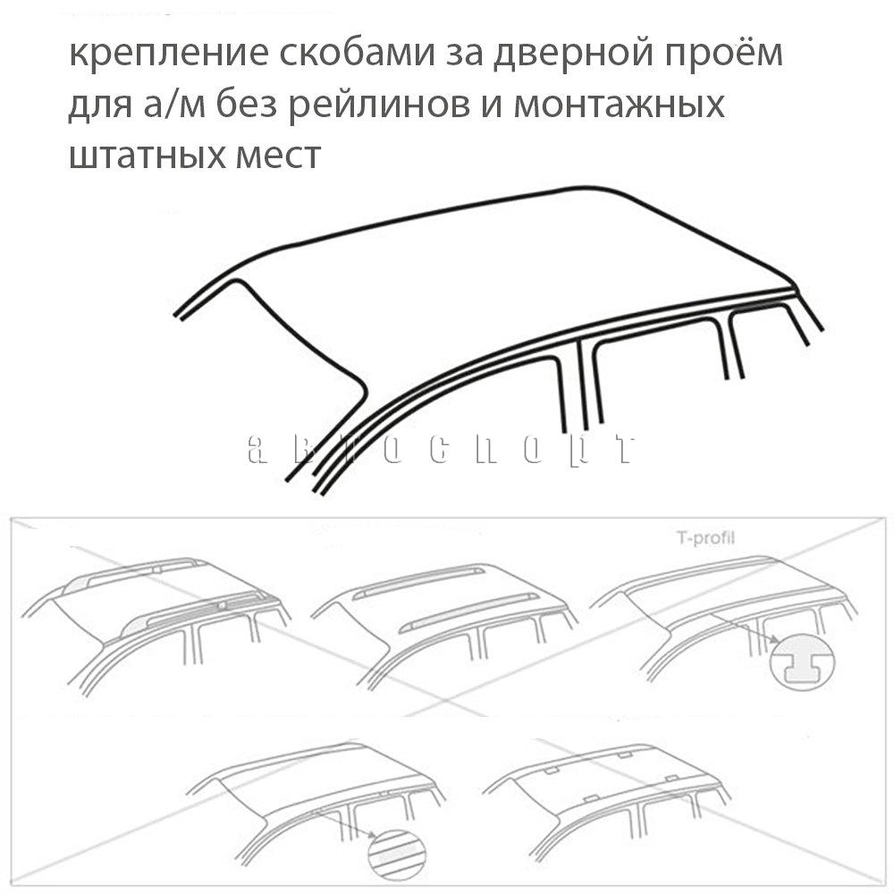 В комплект входит две поперечины и четыре опоры, для установки на автомобили без рейлингов и штатных монтажных мест. Металлические скобы, в основании опор, маркируются под каждую группу автомобилей D1-D7 имеют разную длину и изгиб, для лучшей совместимости и позволяют закрепить их за дверной проем. Резиновые прокладки закрепленные на скобах не дадут оставить царапины при эксплуатации багажника.Собранная конструкция крепко держится и позволяет перевозить грузы весом не больше 75 кг.