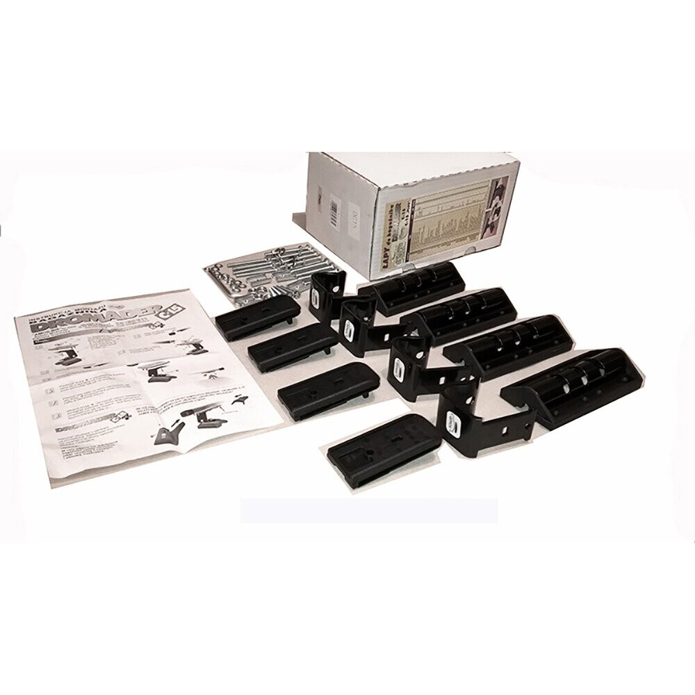 В комплект входит две поперечины и четыре опоры, для установки на автомобили без рейлингов и штатных монтажных мест. Металлические скобы, в основании опор, маркируются под каждую группу автомобилей D1-D7 имеют разную длину и изгиб, для лучшей совместимости и позволяют закрепить их за дверной проем. Резиновые прокладки закрепленные на скобах не дадут оставить царапины при эксплуатации багажника.Собранная конструкция крепко держится и позволяет перевозить грузы весом не больше 75 кг.
