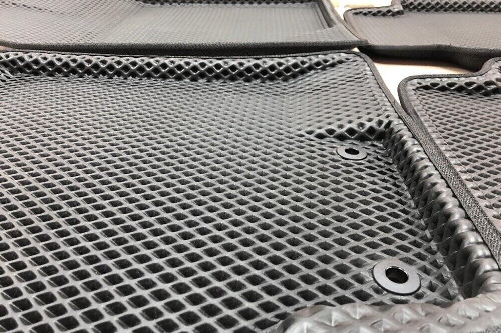 Двухслойные коврики ЕВА 3Д «Ромб» состоят из верхнего слоя EVA и нижнего текстильного слоя, зацепляющегося за ковролин автомобиля, дополнительно имеются крепежные клипсы