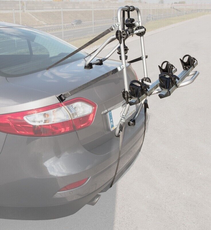 Крепление подходит для автомобилей, не имеющих заднего спойлера, независимо от типа кузова. Фиксация осуществляется при помощи 6 прочных ремней, которые надежно удерживают конструкцию и равномерно распределяют нагрузку. Велосипеды крепятся за раму, что обеспечивает стабильное положение во время движения.