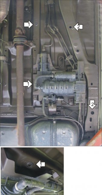 2. Установить на лонжерон левые крепежные точки Защиты с помощью ПУ 60х14х6 А20В10 М8, Болтов М8х20, Шайб 8 и Гроверов 8.\n