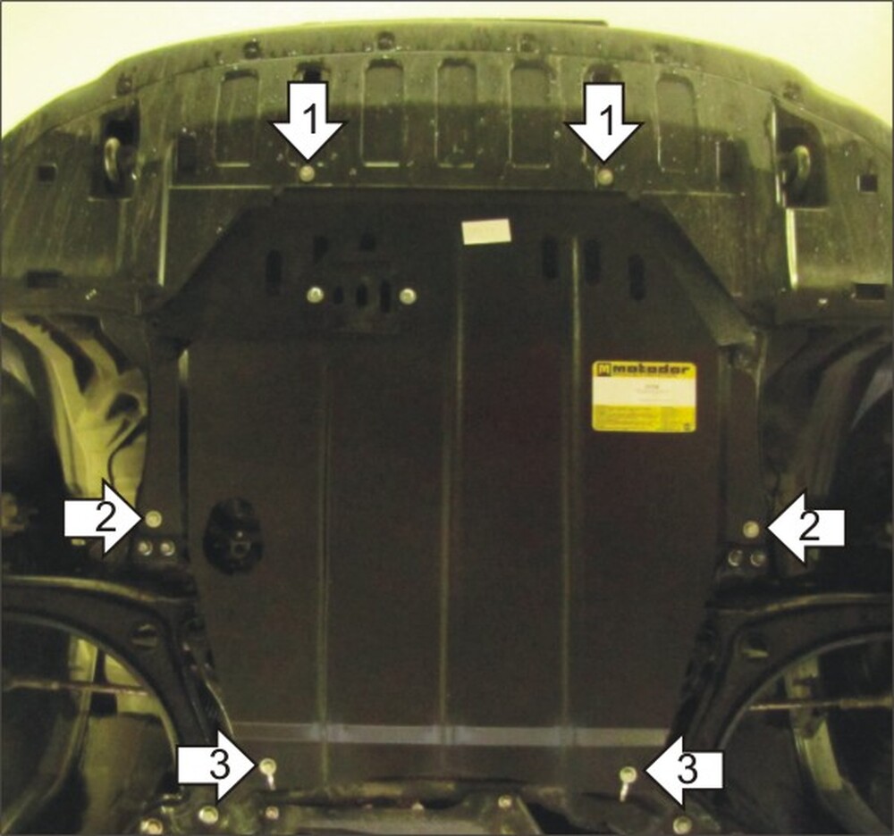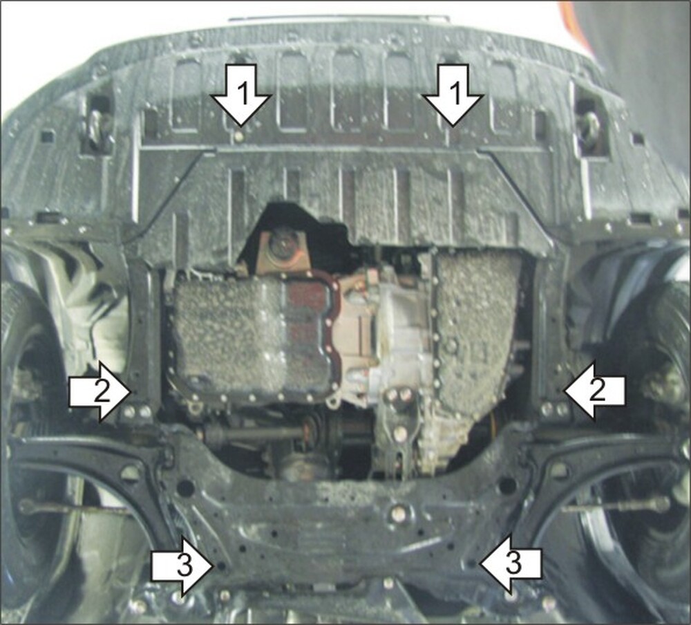 1. Снять штатный пластиковый пыльник. Установить в штатные резьбовые отверстия передние точки защиты при помощи Болто М6х30, Шайб 6 и Гроверов 6.\n