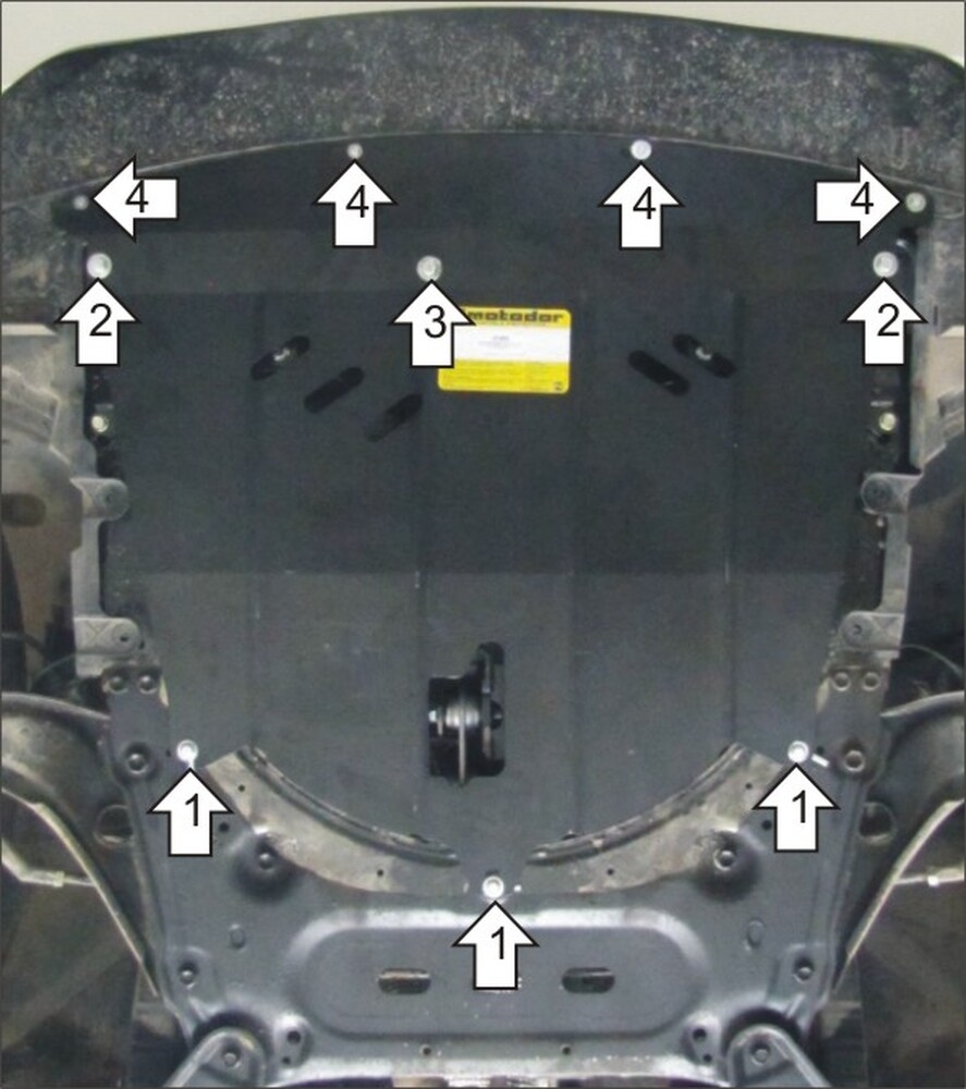 3. В отверстие по центру поперечной балки подрамника установить ПР 80х20х6 М10, установить защиту, используя Болты М10х20 с Шайбами 10 и Гр. Шайбами 10 (аналогичные болты использовать и в крайних точках крепления).\n