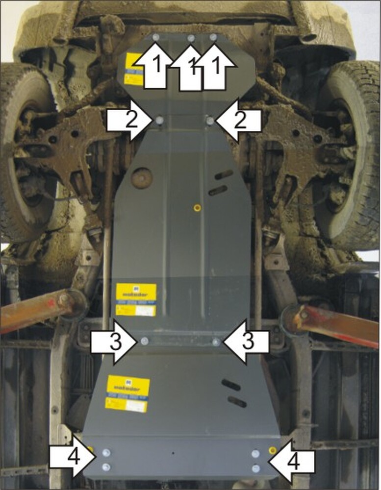 Защищаемые агрегаты: Двигатель, Передний дифференциал, Коробка переключения передач, Радиатор, Раздаточная коробка\n