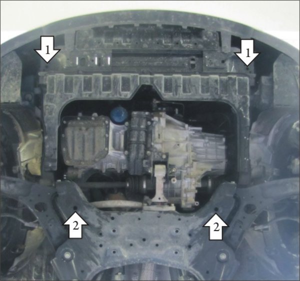 2. Установить в отверстия подрамника а/м задние точки Защиты при помощи ПУ 60х14х6 А20В10 М8 и Болтов М8х30.\n